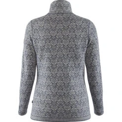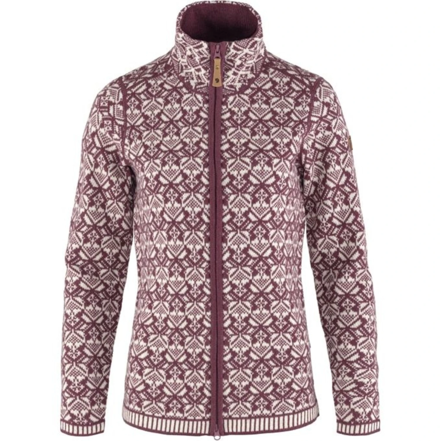 Beautiful jacquard-knitted cardigan in soft, warm lambswool. Two-way zipper at the front and a high straight collar to keep the neck warm. A classic model that is just as suitable for winter walks as it is for everyday use. 100% traceable lambswool. Pattern inspired by Scandinavian folklore. Two-way zipper. Little leather logo on the sleeve.