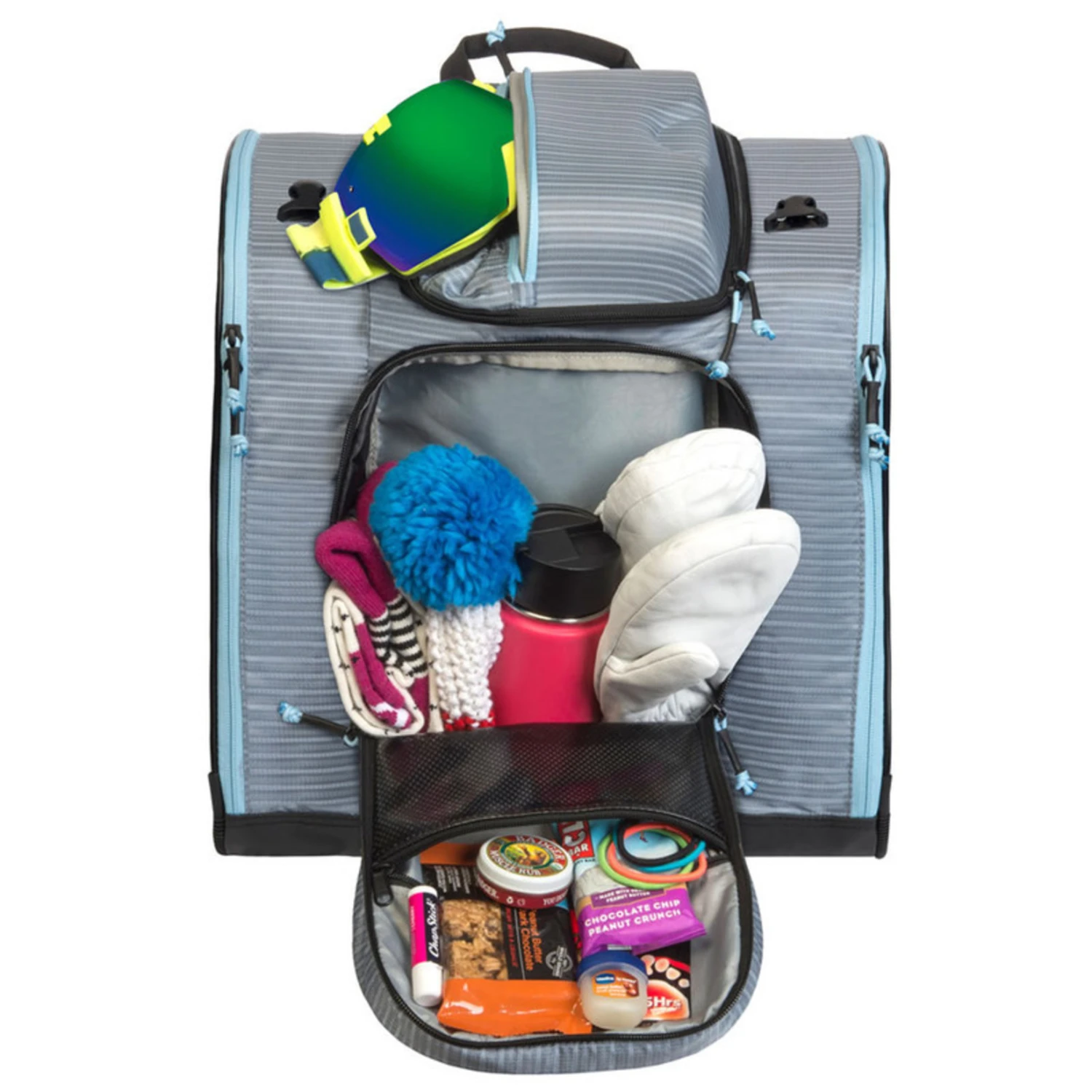 - Smart Topâ„¢ Goggle Protection – Hard shell fleece lined top compartment stores and protects goggles on one side and face coverings on the other.