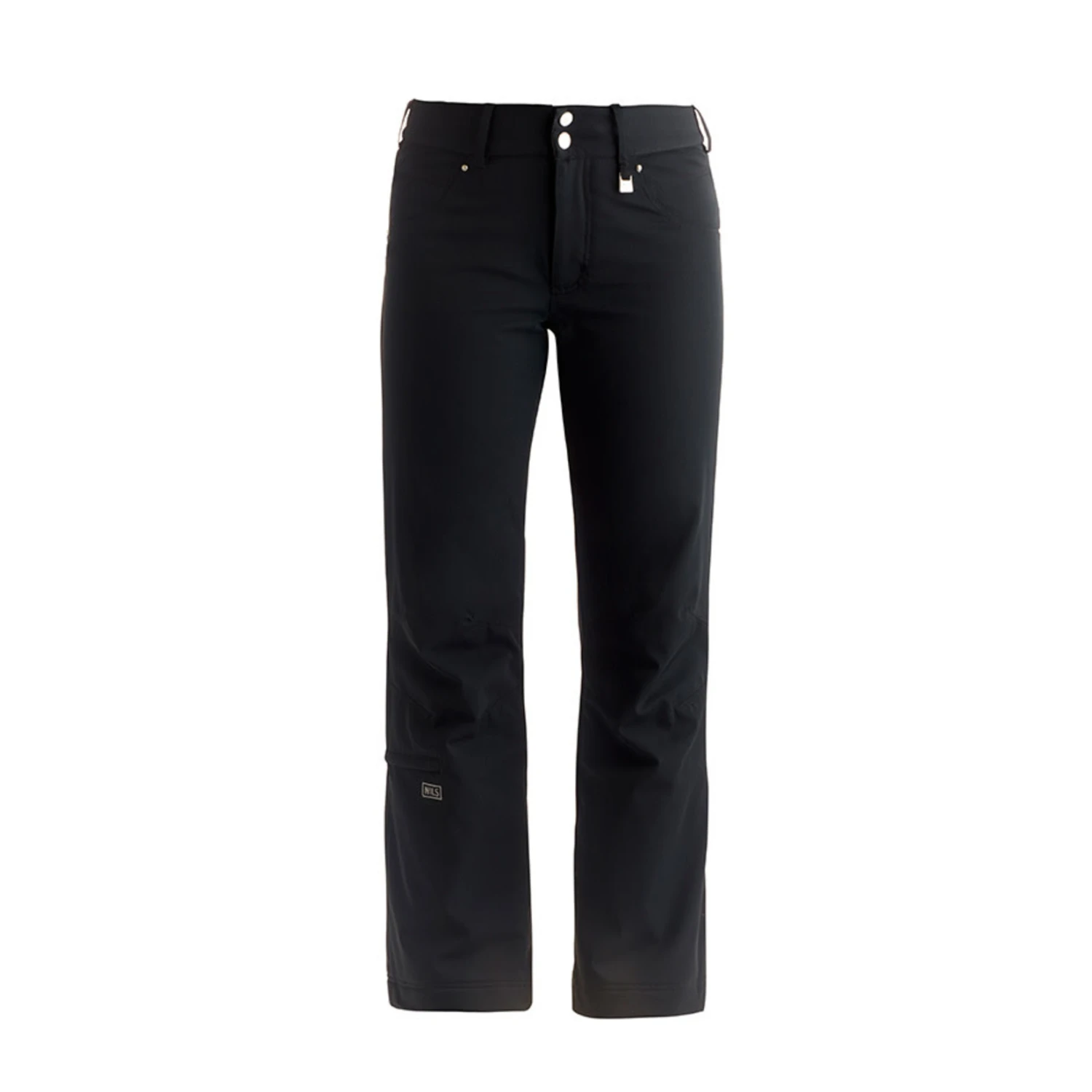 Mid-rise, jean style 4way stretch insulated pant with internal adjustable waist, articualted knees and zippered pockets on back and lower leg.